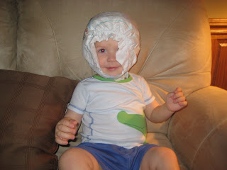 Max emptied out his diapers out of his bag tonight. He was having the best time, so we made him a special hat.